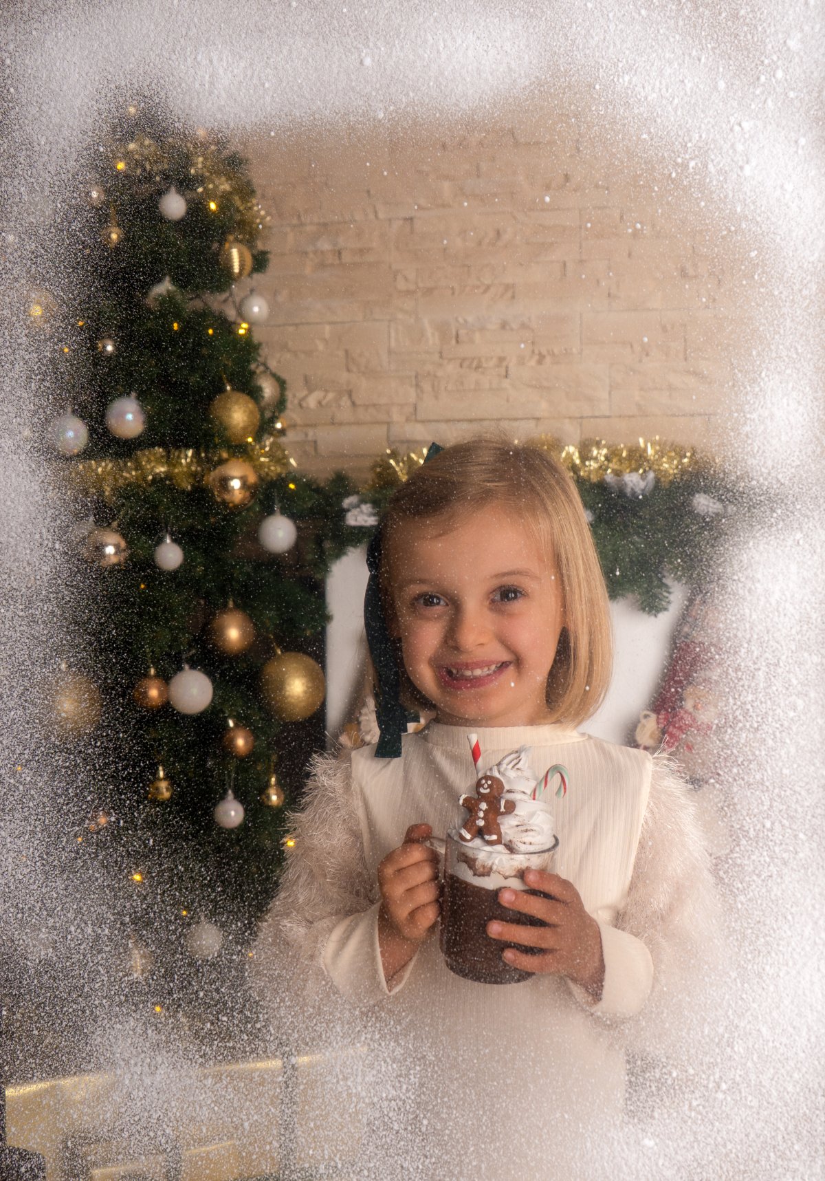 🎁 Cheminée décorée, sapin doré et fenêtre enneigée… tout a été conçu pour que chaque photo devienne un souvenir intemporel ✨